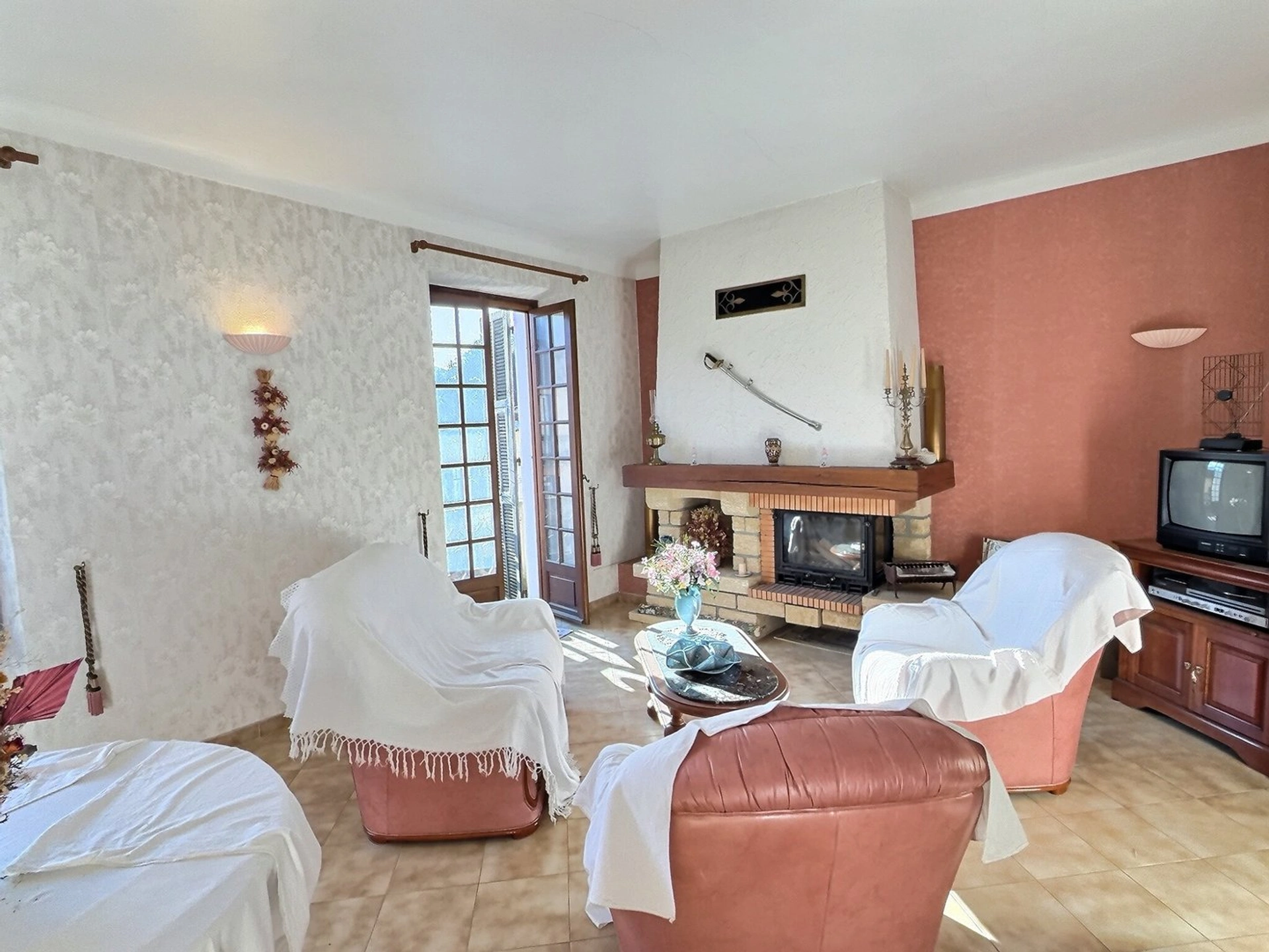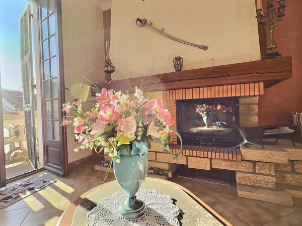Le séjour traversant, largement ouvert sur l’extérieur, profite d’une luminosité naturelle remarquable tout au long de la journée. La cheminée apporte une touche authentique et crée une ambiance chaleureuse, parfaite pour les soirées d’hiver.