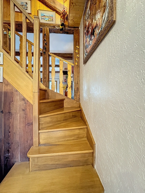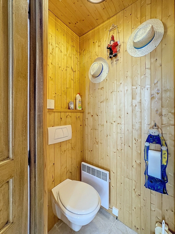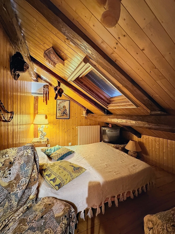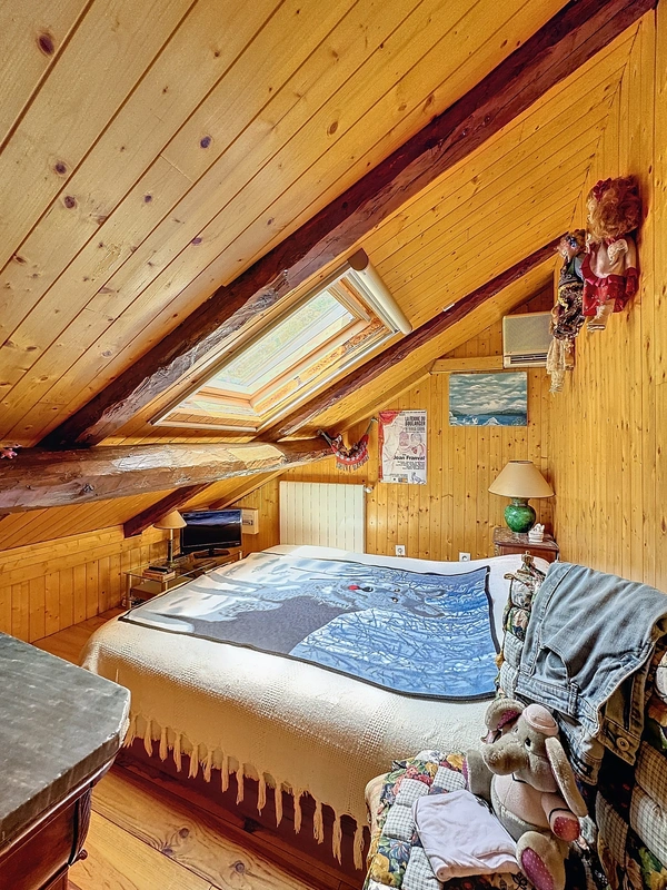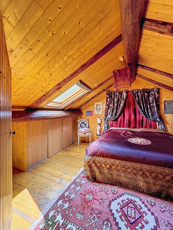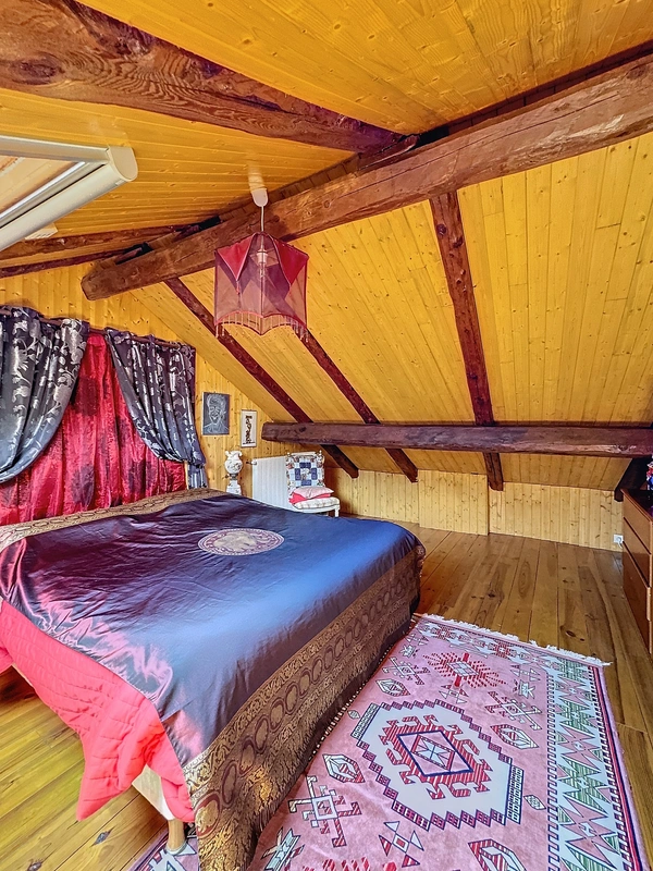 À l'étage, vous trouverez trois belles chambres avec poutres en bois, toutes dotées de vélux, permettant à la lumière de pénétrer pleinement. Ces chambres sont également équipées d'une climatisation réversible pour un confort optimal en été comme en hiver. Des placards sous pentes sont optimisés pour un gain de place maximal. Un toilette est présent également.