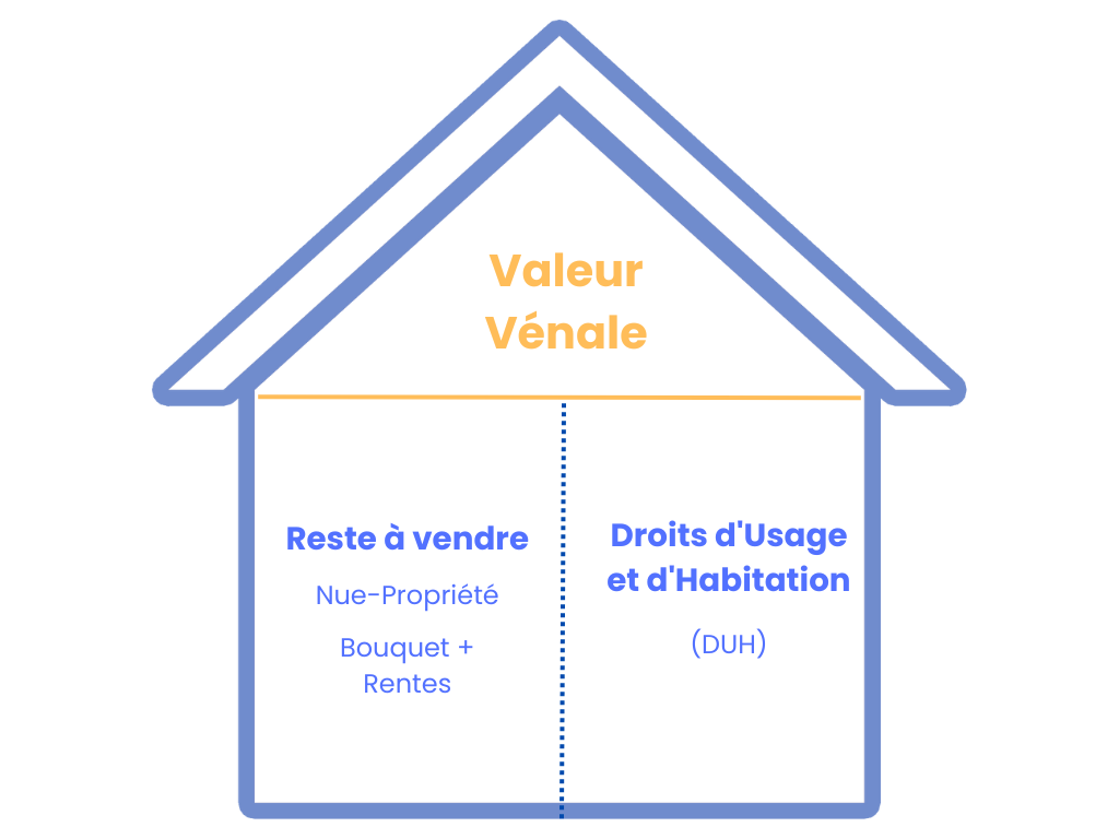 Ci-contre un schéma pour un viager occupé donc avec un DUH (Droit d'Usage et d'Habitation) qui a une certaine valeur calculée selon votre date de naissance ainsi que votre sexe. Oui c'est très précis et donc la valeur vénale de votre maison doit être maitrisér afin d'obtenir un résultat fiable et concrêt.